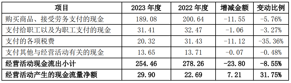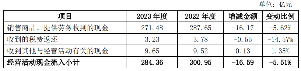 回復:2023年公司實現(xiàn)營業(yè)收入282.35億元,同比下降18.26%;凈利潤-17.48億元,同比下降224.28%;經營活動產生的現(xiàn)金流量凈額29.9億元,同比增加31.75%,主要原因為通過持續(xù)推進精細化管理,合理控制存貨庫存,優(yōu)化調整采購付款節(jié)奏,支付的各項稅費同比減少,進一步減少經營資金的支出,使經營活動現(xiàn)金流量得到了一定的改善。公司經營活動現(xiàn)金流量明細見下表: