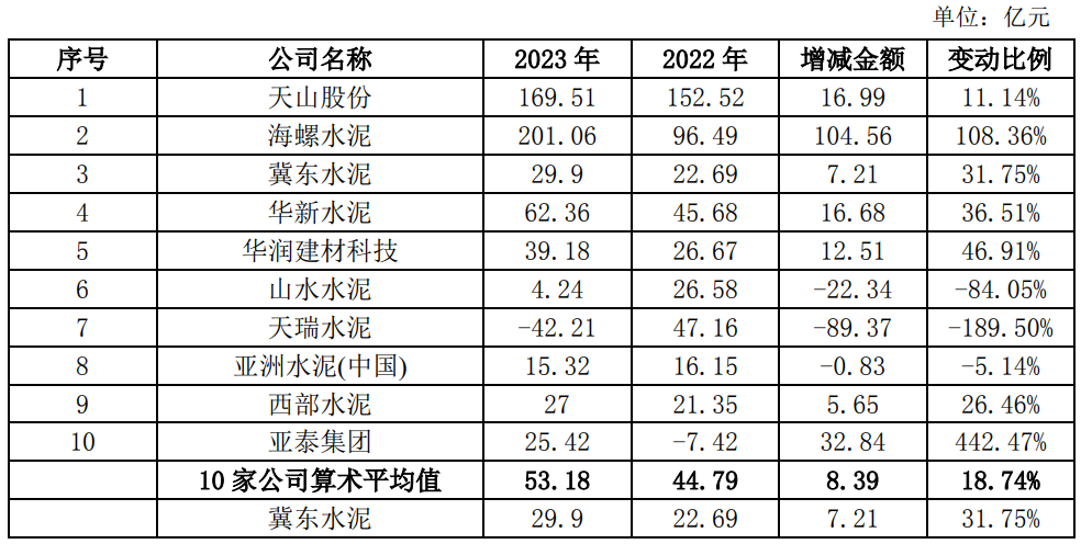 根據(jù)中國證監(jiān)會行業(yè)分類,公司屬于C30大類“非金屬礦物制品業(yè)”,其中,主營業(yè)務包括水泥及熟料的A股、H股上市公司共計22家,選取2023年上市公司產能規(guī)模前10名(來源:數(shù)字水泥網(wǎng))水泥企業(yè)進行對比,具體情況如下: