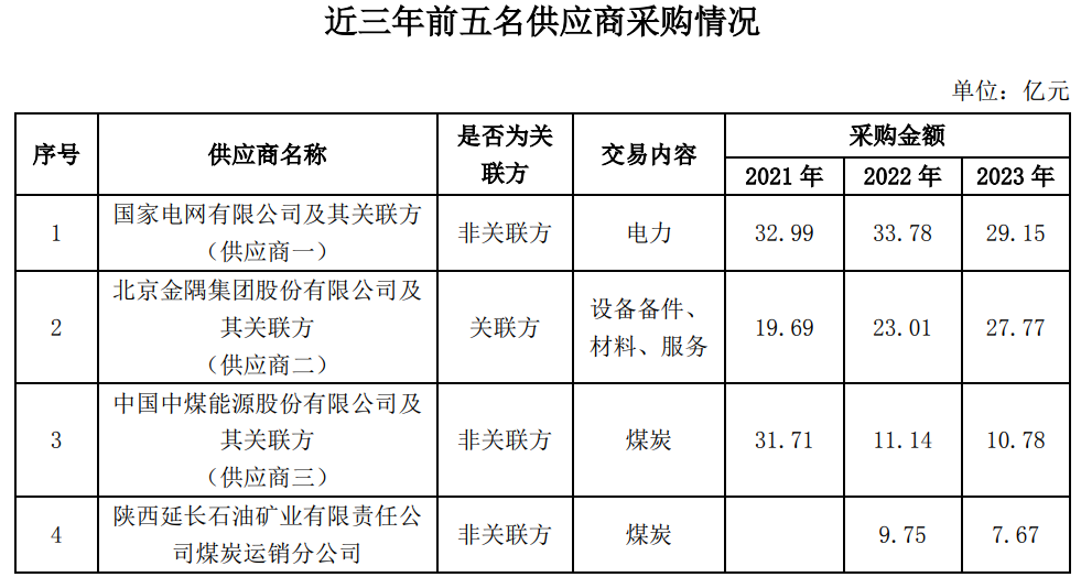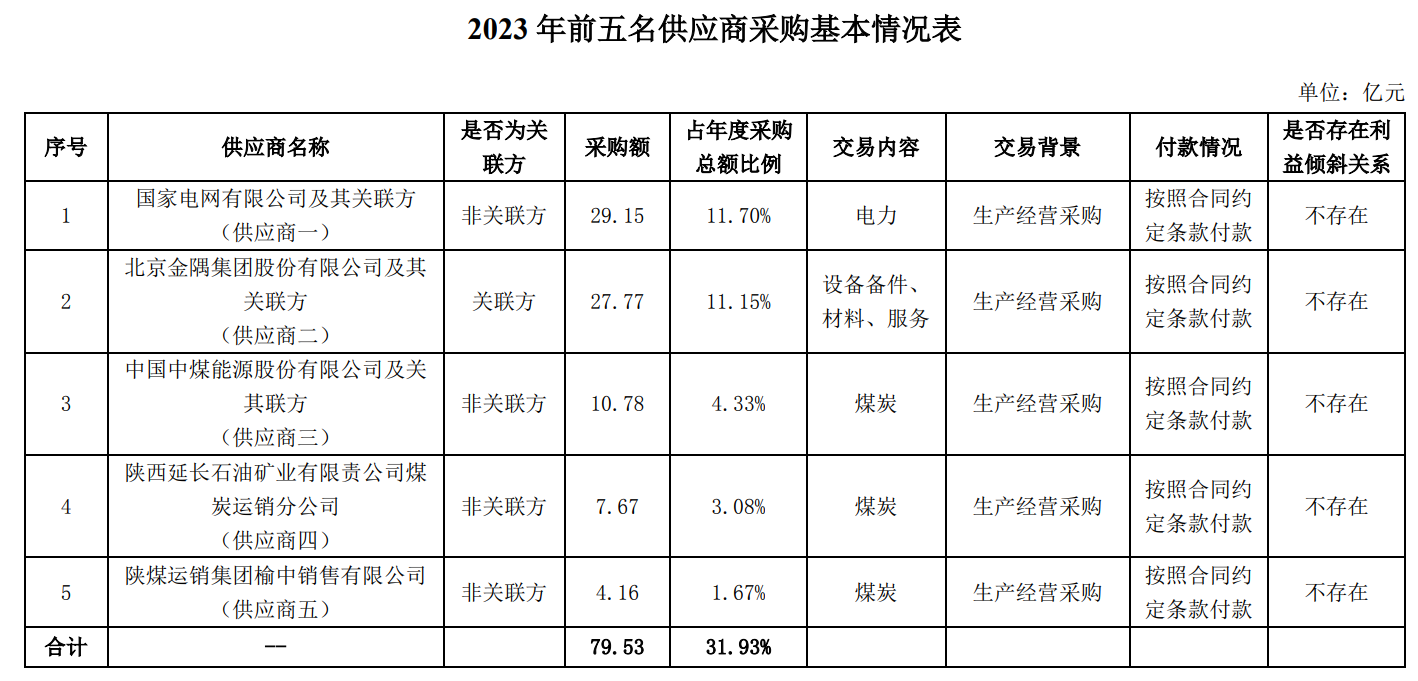 回復:2023年度,前五名供應商合計采購金額為79.53億元,占年度采購總額比例為31.93%,其中關聯(lián)方采購金額為27.77億元,占年度采購總額比例為11.15%。與關聯(lián)方發(fā)生的采購主要為采購機械設備及備件、設備維修服務等,所發(fā)生的關聯(lián)交易均履行了必要的審議程序及信息披露義務,且實際發(fā)生的交易金額均在公司董事會及股東大會批準的額度內,不存在利益傾斜情形。前五名供應商的基本情況見下表: