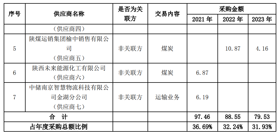 2023年公司前五名供應商中供應商三、四、五為煤炭供應商合計采購金額為22.61億元,占年度采購總額的9.08%,占公司全部煤炭采購份額的28%左右,三家煤炭供應商分別約占公司全部煤炭采購份額的13、10%、5%;公司始終秉承公平公正的原則,推行煤炭統(tǒng)采、直采,注重采購渠道的管理,降低采購成本,不存在對某個供應商有重大依賴。