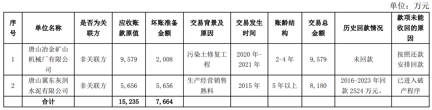 截至2023年12月31日,公司1年以上應收賬款余額12.64億元,占應收賬款總額的44.1%,占營業(yè)收入的4.5%,主要涉及水泥銷售、危廢固廢處置等業(yè)務。水泥業(yè)務1年以上應收賬款主要為國家的“鐵、公、機”等大型基礎建設項目的施工單位,客戶群體主要為央企國企,水泥用量大且施工周期長,貨款結算周期長,資金風險可控。危廢固廢處置業(yè)務1年以上應收賬款主要為應收政府款項,由于各地財政資金緊張,尚未回款,公司對應收政府款項制定清理方案,積極與政府進行溝通。