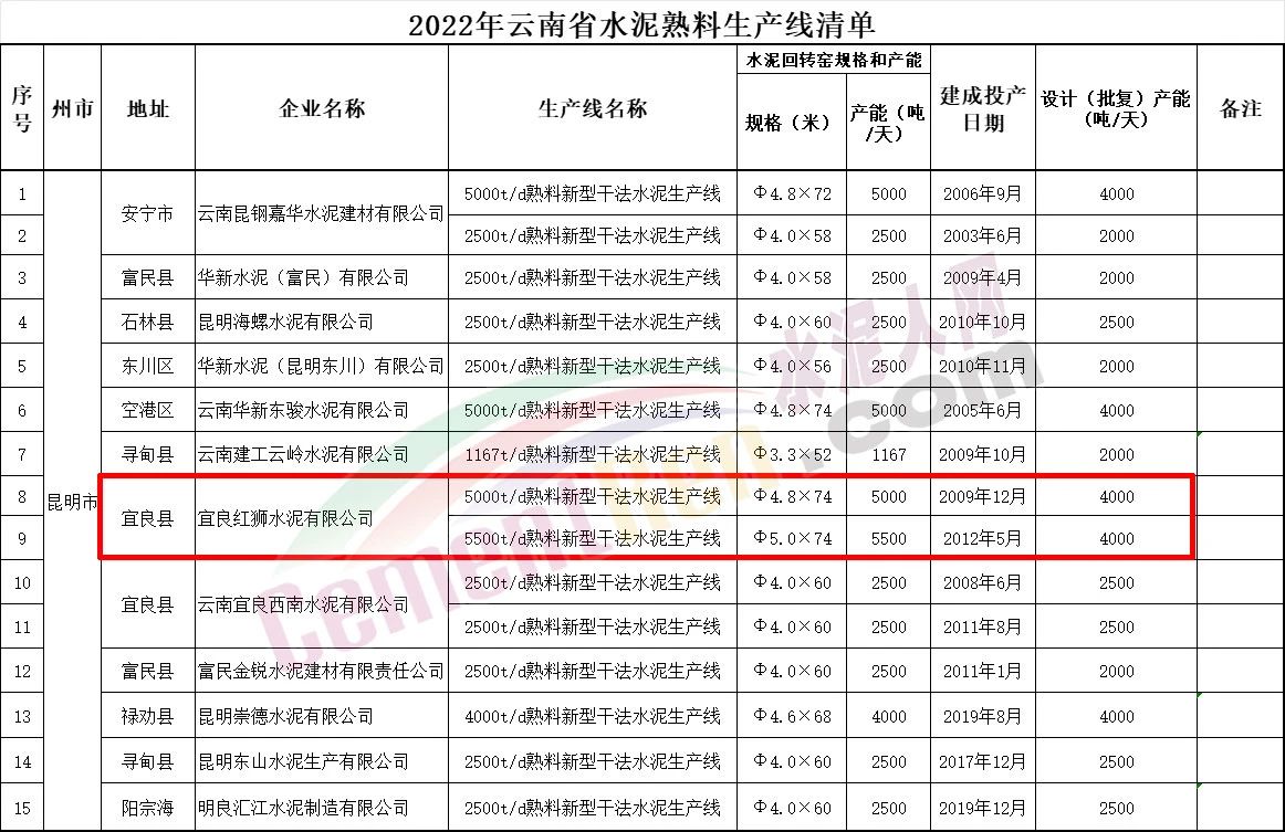 按照《云南省工業(yè)和信息化廳關于云南省水泥熟料平板玻璃生產線清單的公告》,明確宜良紅獅水泥有限公司為1條5000噸/天熟料新型干法水泥生產線(一期)、1條5500噸/天熟料新型干法水泥生產線(二期),產能合計10500噸/天。
