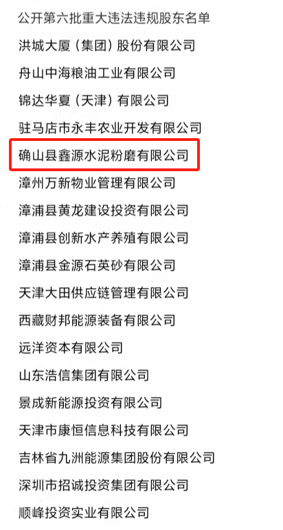 6月14日, 金融監(jiān)管總局近日公開了第六批共18名重大違法違規(guī)股東名單,確山縣鑫源水泥粉磨有限公司被列在處罰名單。