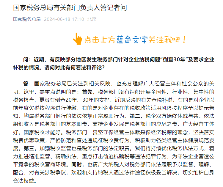 6月18日,國家稅務(wù)總局官方微信發(fā)布答記者問消息。”辟謠“部分地區(qū)發(fā)生稅務(wù)部門針對企業(yè)納稅問題“倒查30年”及要求企業(yè)補(bǔ)稅的相關(guān)問題。