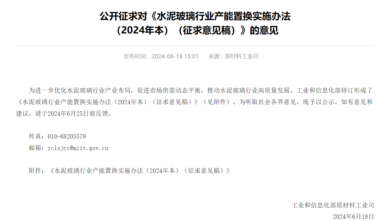 6月18日,工信部發(fā)布《水泥玻璃行業(yè)產(chǎn)能置換實(shí)施辦法(2024年本)(征求意見(jiàn)稿)》公開(kāi)征求意見(jiàn)。