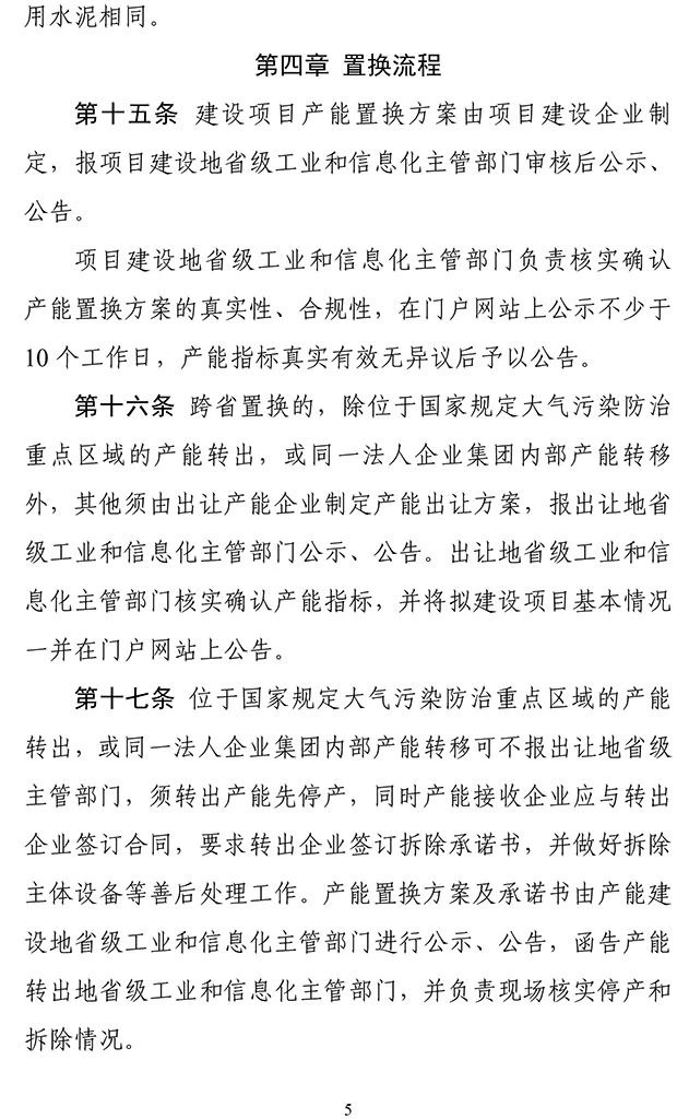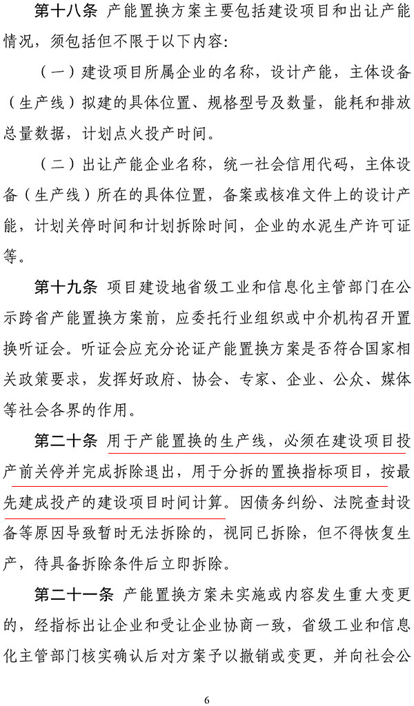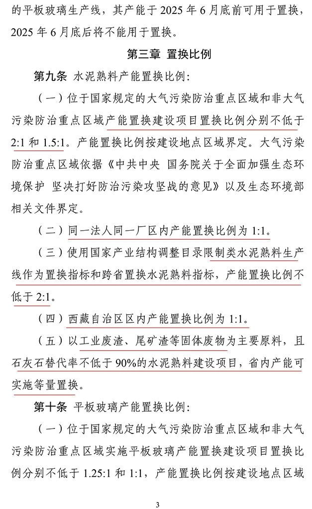 用于置換的水泥熟料生產(chǎn)線(xiàn)產(chǎn)能不能拆分轉(zhuǎn)讓。位于國(guó)家規(guī)定的大氣污染防治重點(diǎn)區(qū)域或水泥熟料產(chǎn)能利用率低于50%省區(qū)的新建水泥熟料生產(chǎn)線(xiàn),原則上不得從省外置換產(chǎn)能。另外還提及水泥熟料產(chǎn)能置換比例要求。