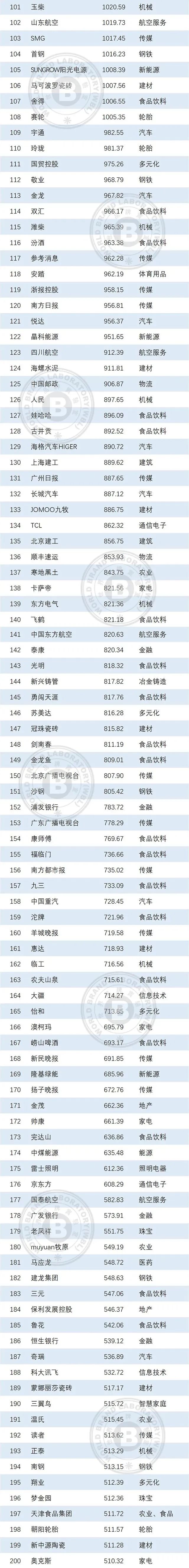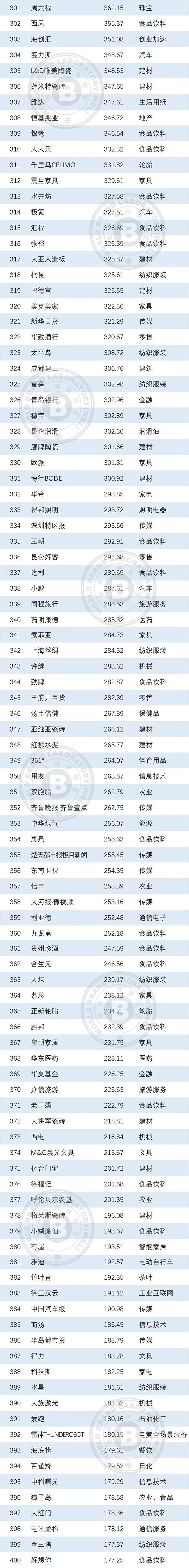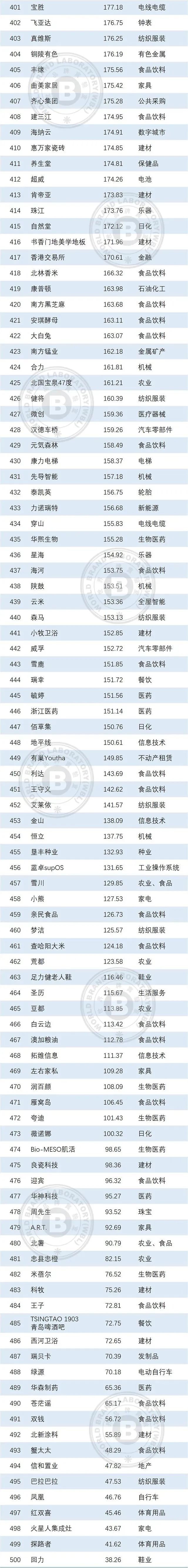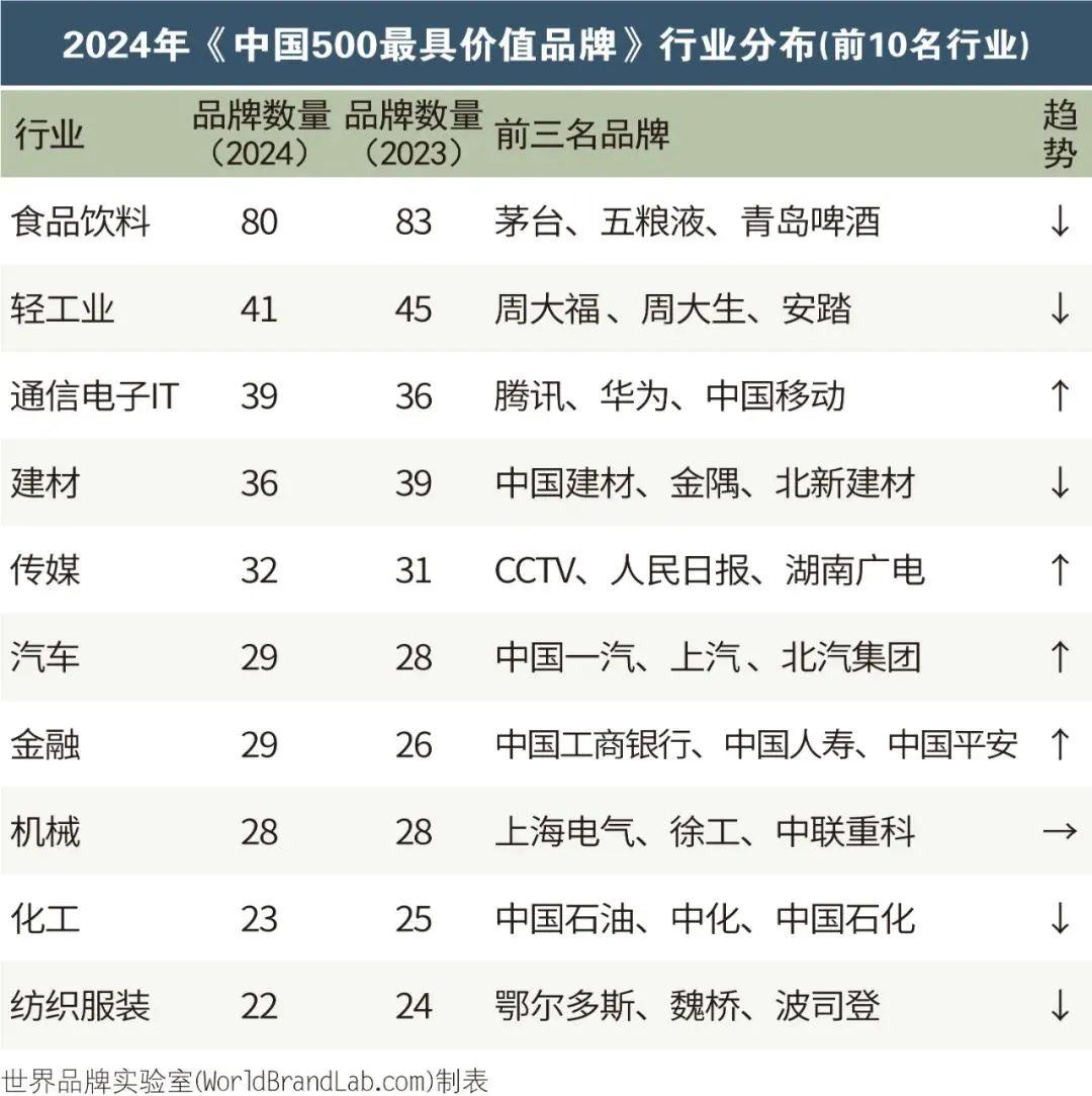 本年度《中國500最具價值品牌》排行榜中,共有來自食品飲料、輕工業(yè)、建材、傳媒、紡織服裝、醫(yī)藥、機(jī)械等在內(nèi)的24個相關(guān)行業(yè)的品牌入選。其中食品飲料業(yè)依然是入選品牌最多的行業(yè),共有80個品牌入選,占總?cè)脒x品牌數(shù)的16.00%;入選數(shù)量位居第二到第五的行業(yè)分別是輕工(41個)、通信電子IT(39個)、建材(36個)、傳媒(32個)。在衡量品牌的忠誠度時,世界品牌實(shí)驗(yàn)室參考了我信品牌(iTrust Rating)的評級數(shù)據(jù);在衡量品牌的領(lǐng)導(dǎo)力特別是ESG(環(huán)境、社會和治理)評分時,參考了超級財經(jīng)(SuperFinance)的ESG數(shù)據(jù)庫。同時還借用了低碳國際(Carboncare International)對品牌企業(yè)碳排放的計量,以推動品牌添加“碳排放評分”標(biāo)簽。