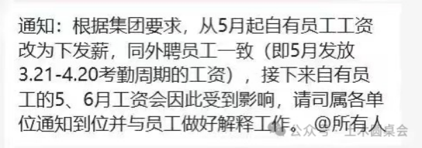 中建某局前期流出消息稱:集團(tuán)薪資結(jié)構(gòu)自有員工也開始進(jìn)行調(diào)整了,根據(jù)集團(tuán)要求,從五月起自有員工工資改成下發(fā)薪,同外聘員工一起5月發(fā)放:3月21~4月20日的考勤周期的工資,接下來幾個(gè)月自有員工的工資會(huì)因此受到影響,請(qǐng)各單位及時(shí)與員工做好溝通解釋。