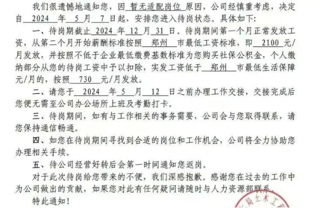 某央企旗下土木公司發(fā)布通知,對(duì)于暫無適崗位的員工全部進(jìn)入待崗狀態(tài),待崗期間第一個(gè)月正常發(fā)放工資,從第二個(gè)月開始,按照鄭州市最低工資標(biāo)準(zhǔn),即2100元/月發(fā)放,并按照不低于企業(yè)最低繳費(fèi)基數(shù)標(biāo)準(zhǔn)購買社保金積金,實(shí)發(fā)工資低鄭州市最低生活保障的,按照730元/月發(fā)放。