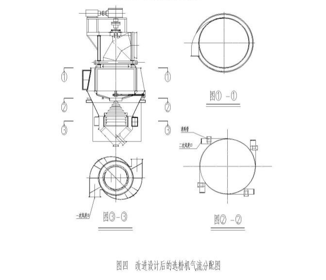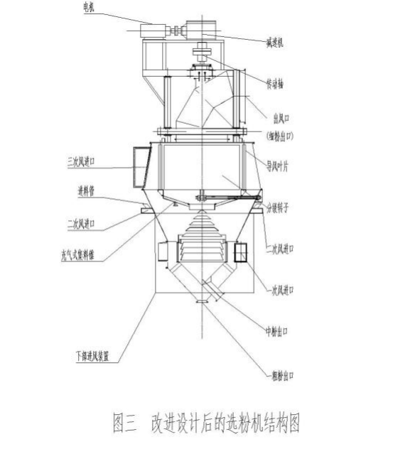 (1)改進(jìn)后選粉機(jī)的的結(jié)構(gòu)(如圖三所示),對比圖二、圖三可以看出,選粉機(jī)結(jié)構(gòu)做了三個(gè)改進(jìn):