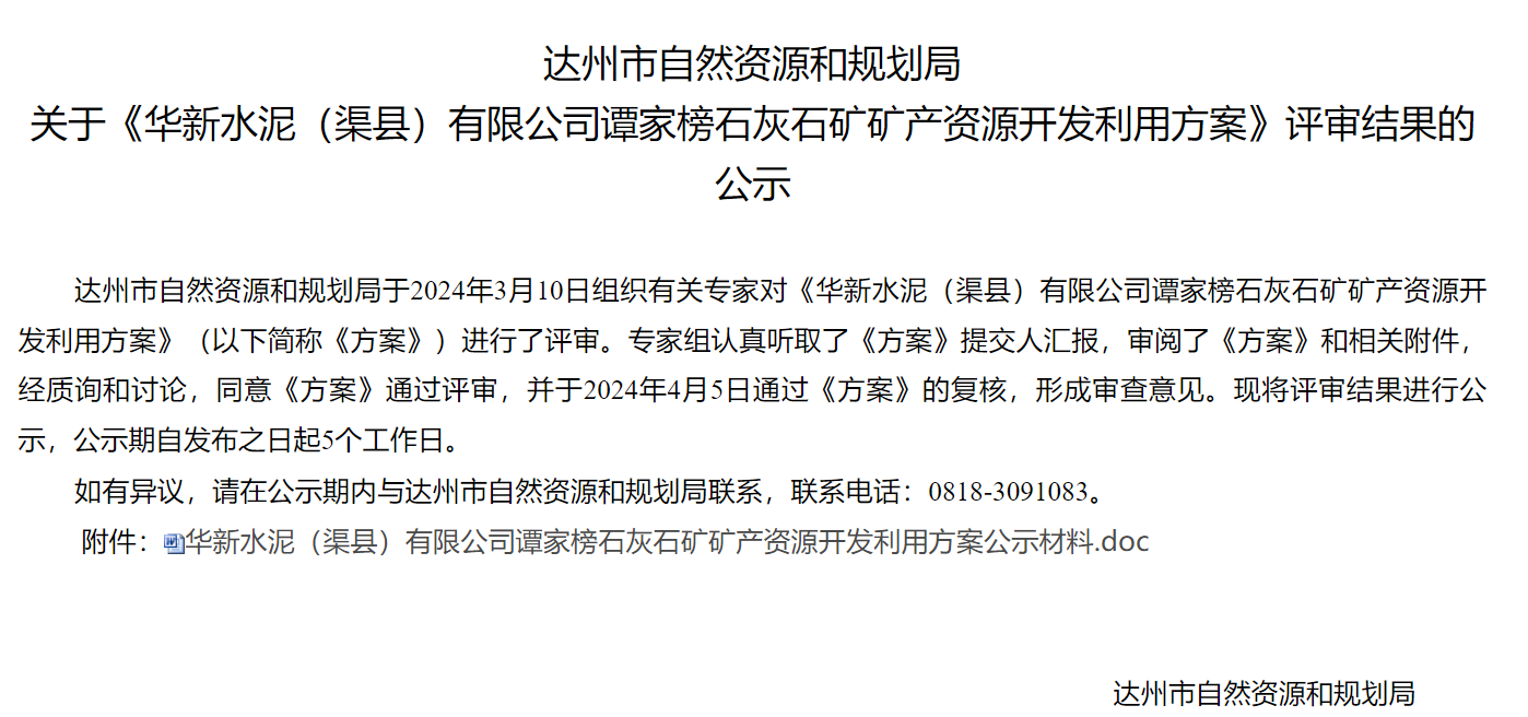 近日,華新水泥(渠縣)有限公司譚家榜石灰石礦礦產(chǎn)資源開發(fā)利用方案通過評審。