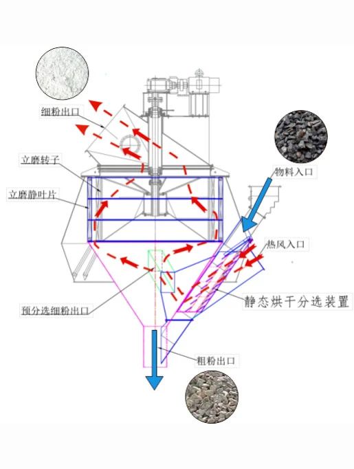 傳統(tǒng)立磨系統(tǒng)中,被粉磨物料都是通過中心喂料或邊沿喂料的方式,物料直接送到旋轉的磨盤上。物料在離心力作用下向磨盤邊緣移動的過程中,經磨輥碾壓粉磨后,被甩到磨盤周圍的噴嘴環(huán)上,噴嘴環(huán)內高速噴出的熱風將物料烘干、打散和分選,粗顆粒物料落回磨盤被再次粉磨,細粉隨風進入立磨選粉機二次分選,合格細粉進入轉子,作為成品收集入庫,不合格細粉落回磨盤,進入下一個粉磨、烘干、打散、分選的循環(huán)。