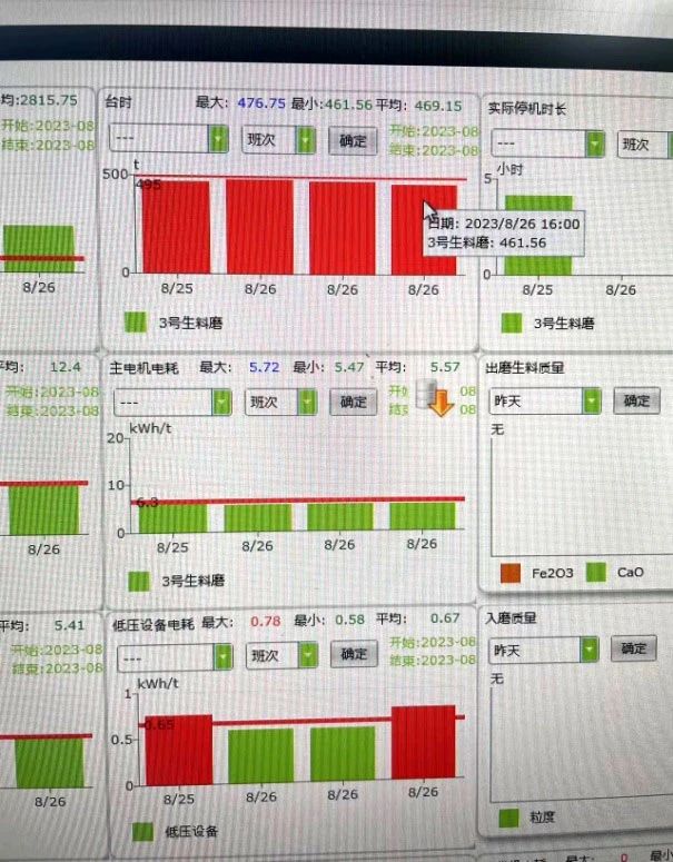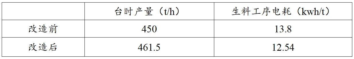 經統(tǒng)計,系統(tǒng)臺時產量較改造前產量提升了11.5t/h,粉磨電耗較改造前降低了1.26kwh/t。改在后指標對照如下: