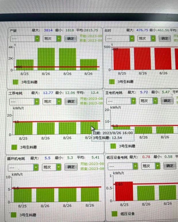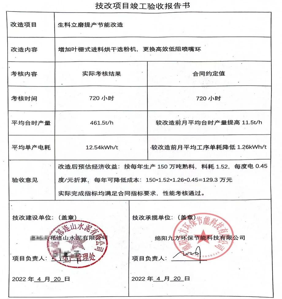 經過改造后按每年生產150萬噸熟料,料耗1.52,每度電0.45度/元計算,每年可降低成本:150*1.52*1.26*0.45=129.3萬元。