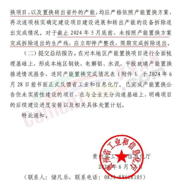 要求涉及產(chǎn)能指標(biāo)轉(zhuǎn)入貴州省的產(chǎn)能置換項(xiàng)目,以及置換轉(zhuǎn)出省外的產(chǎn)能,均應(yīng)嚴(yán)格依照產(chǎn)能置換方案,再次逐項(xiàng)核實(shí)確定建設(shè)項(xiàng)目建設(shè)進(jìn)展和轉(zhuǎn)出產(chǎn)能的設(shè)備拆除退出完成情況。對(duì)于截止2024年5月底前,未按照產(chǎn)能置換方案完成拆除退出的生產(chǎn)線(xiàn),應(yīng)立即停產(chǎn)整改,限期完成拆除退出。