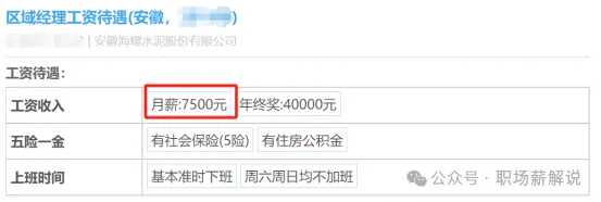 員工3:該爆料者是海螺水泥的一名區(qū)域經(jīng)理,他現(xiàn)在每個月的工資是7500元,年終獎金是40000元,也有五險和住房公積金。他這個屬于管理層了,加班也不多,還算是不錯的。