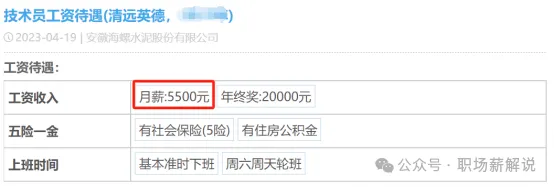 員工4:該爆料者是海螺水泥的一名技術(shù)員,他現(xiàn)在的薪資是5500元一個月,年終獎金是10000元,也有五險和住房公積金。他這個崗位也是周末需要輪班,加班的話比較少,基本不加班。