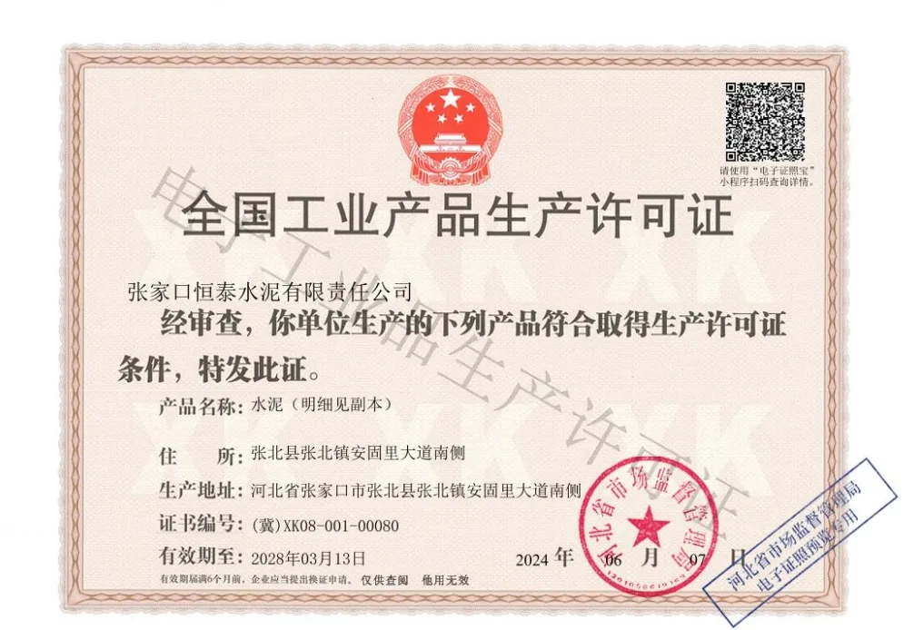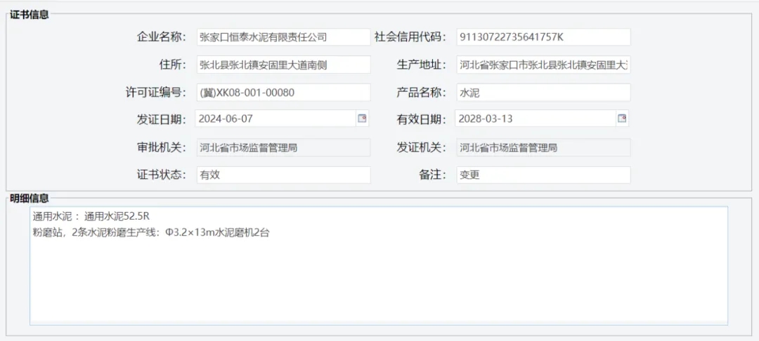 據(jù)公開信息,張家口恒泰水泥有限責(zé)任公司,生產(chǎn)許可證編號:(冀)XK08-001-00080,有效期至2028年3月13日。生產(chǎn)地址位于河北省張家口市張北縣張北鎮(zhèn)安固里大道南側(cè);許可產(chǎn)品為通用水泥,企業(yè)類型為粉磨站,擁有兩條水泥粉磨生產(chǎn)線,關(guān)鍵設(shè)備Φ3.2×13m水泥磨機(jī)兩臺。