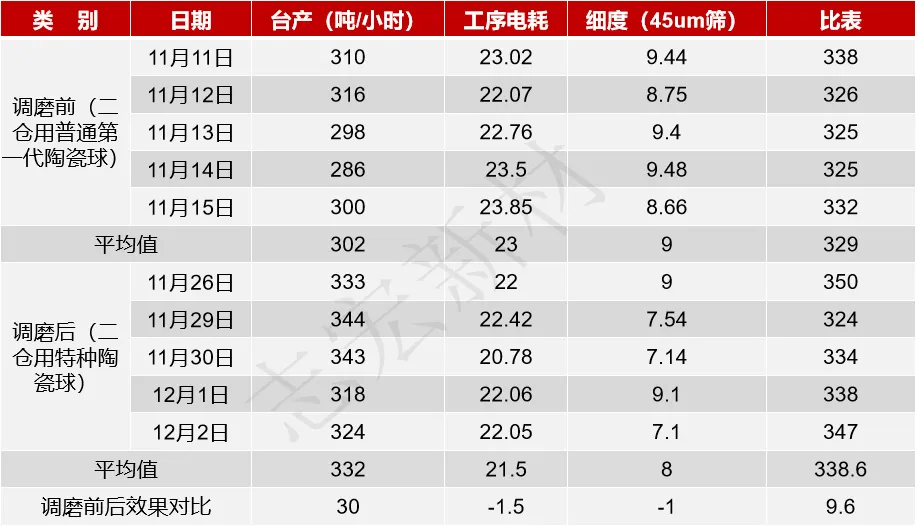 貴州某水泥企業(yè)水泥磨粉磨工序調(diào)磨前后統(tǒng)計(jì)數(shù)據(jù)及對(duì)比