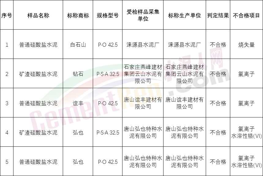 河北省市場監(jiān)管局為進一步加強我省產品質量安全監(jiān)管,采取購買樣品方式,抽查檢測水泥等產品,檢出水泥不合格樣品5批次。