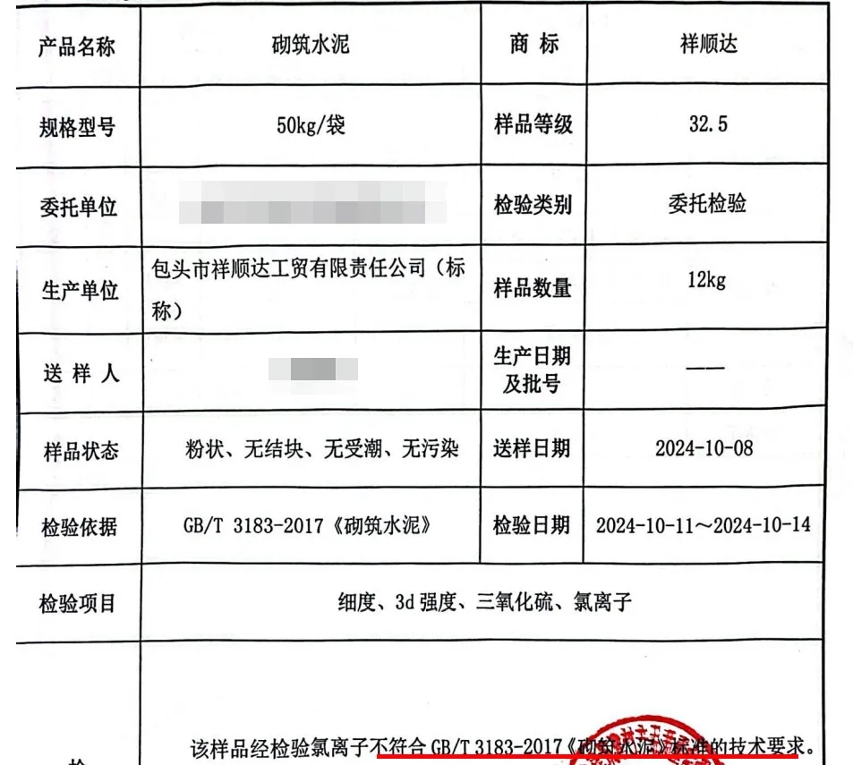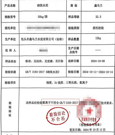 標稱為包頭市鑫烏蘭水泥有限公司生產的一批次“鑫烏蘭”牌,砌筑M32.5水泥氯離子含量0.18%,較標準要求高出3倍,不符合標準要求,檢驗結論為不合格。