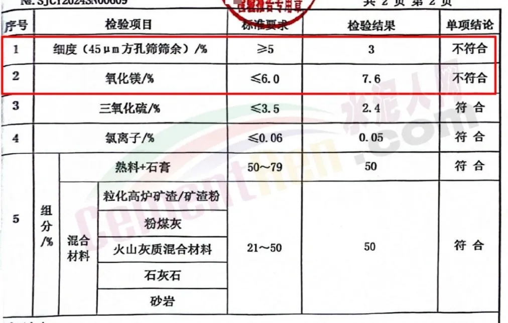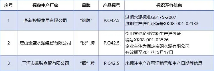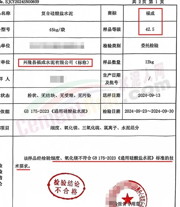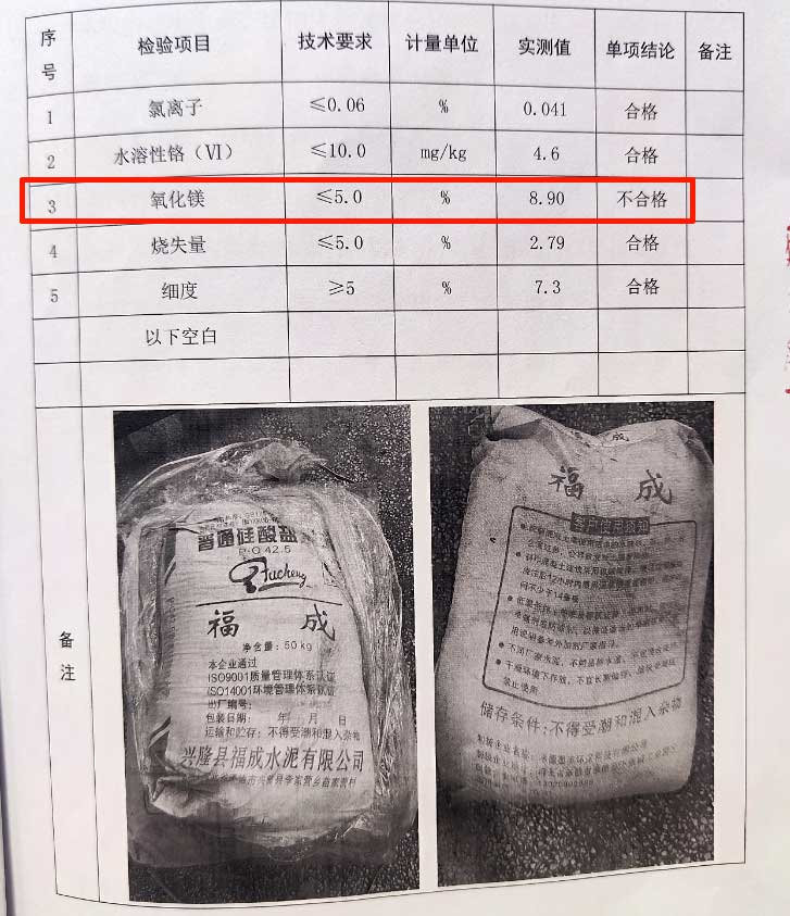 同期發(fā)現(xiàn)的標稱為興隆縣福成水泥有限公司生產的“福成”牌P.C42.5水泥一批次細度和氧化鎂項目與標準要求不符。
