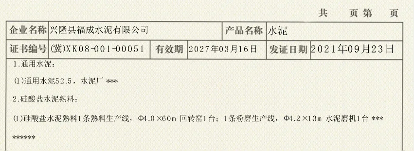 從公開信息可見,興隆縣福成水泥有限公司企業(yè)類型為全能水泥廠。許可產品為通用水泥及硅酸鹽水泥熟料;企業(yè)擁有1條熟料生產線和1條粉磨生產線,關鍵設備為Ф4.0*60m回轉窯1臺,4.2*13m水泥磨機1臺;