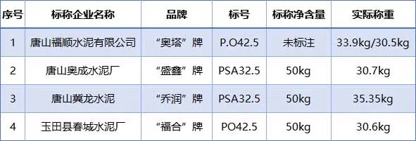 凈含量與標準要求不符的水泥產品4個批次