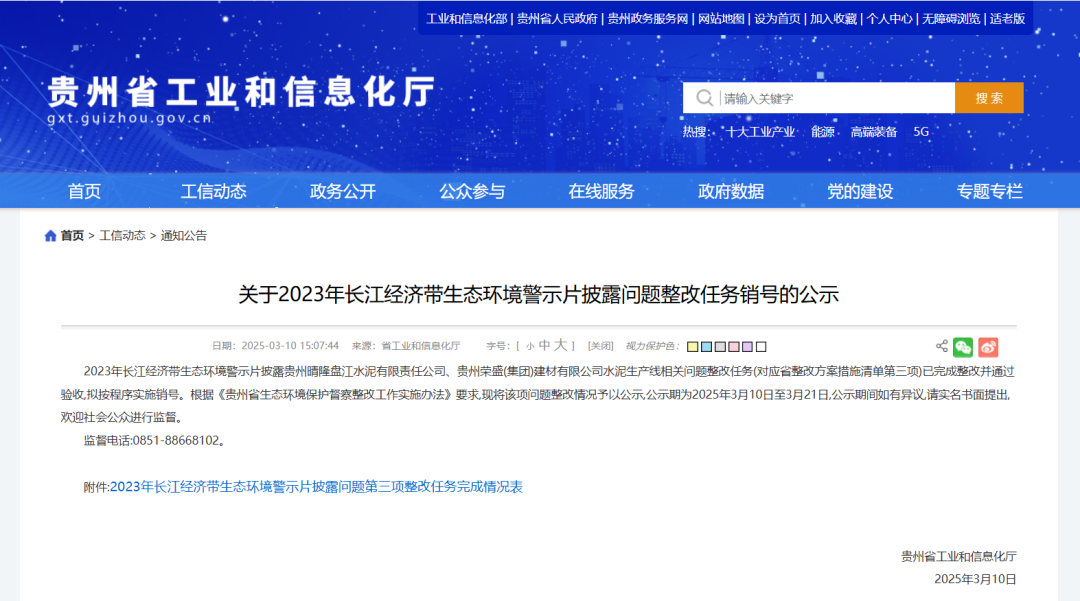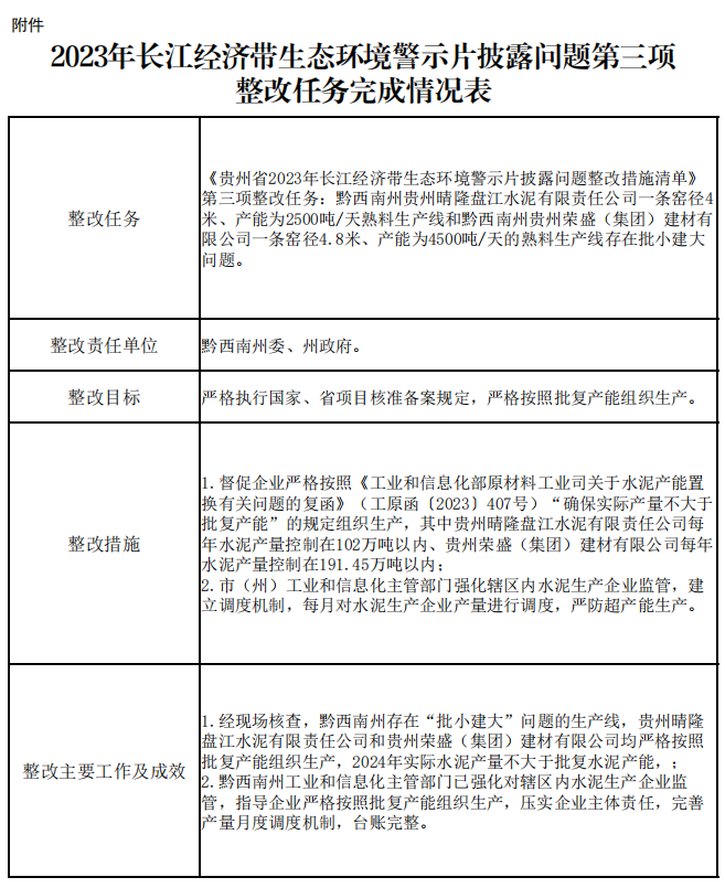 3月10日,貴州省工業(yè)和信息化廳發(fā)布關(guān)于2023年長江經(jīng)濟(jì)帶生態(tài)環(huán)境警示片披露問題整改任務(wù)銷號的公示稱,《貴州省2023年長江經(jīng)濟(jì)帶生態(tài)環(huán)境警示片披露問題整改措施清單》第三項(xiàng)整改任務(wù):黔西南州貴州晴隆盤江水泥有限責(zé)任公司一條窯徑4米、產(chǎn)能為2500噸/天熟料生產(chǎn)線和黔西南州貴州榮盛(集團(tuán))建材有限公司一條窯徑4.8米、產(chǎn)能為4500噸/天的熟料生產(chǎn)線存在批小建大問題。