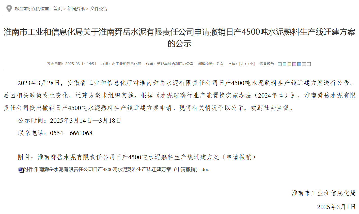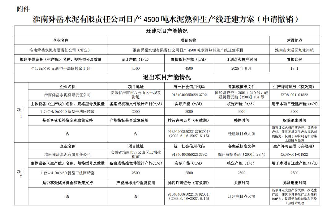 日前,安徽淮南市工業(yè)和信息化局發(fā)布《關(guān)于淮南舜岳水泥有限責(zé)任公司申請撤銷日產(chǎn)4500噸水泥熟料生產(chǎn)線遷建方案的公示》稱,2023年3月28日,安徽省工業(yè)和信息化廳對淮南舜岳水泥有限責(zé)任公司日產(chǎn)4500噸水泥熟料生產(chǎn)線遷建方案進(jìn)行公告。后因相關(guān)政策發(fā)生變化,遷建方案未組織實施。根據(jù)《水泥玻璃行業(yè)產(chǎn)能置換實施辦法(2024年本)》,淮南舜岳水泥有限責(zé)任公司提出撤銷日產(chǎn)4500噸水泥熟料生產(chǎn)線遷建方案申請?,F(xiàn)將有關(guān)情況予以公示,歡迎社會監(jiān)督。公示時間:2025年3月14日—3月18日聯(lián)系電話:0554—6661068.
