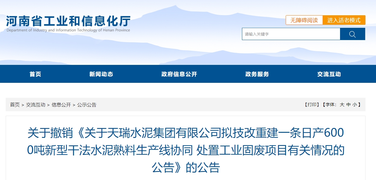 近日,河南工信廳發(fā)布關(guān)于撤銷《關(guān)于天瑞水泥集團有限公司擬技改重建一條日產(chǎn)6000噸新型干法水泥熟料生產(chǎn)線協(xié)同 處置工業(yè)固廢項目有關(guān)情況的公告》的公告稱: