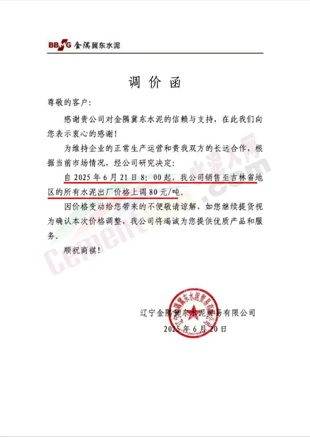 遼寧金隅冀東水泥貿(mào)易有限公司通知稱,為維持企業(yè)的正常生產(chǎn)運營,根據(jù)當前市場情況,經(jīng)公司研究決定,自2025年6月21日8時起,公司銷售至吉林省地區(qū)的所有水泥出廠價格上調(diào)80元/噸。