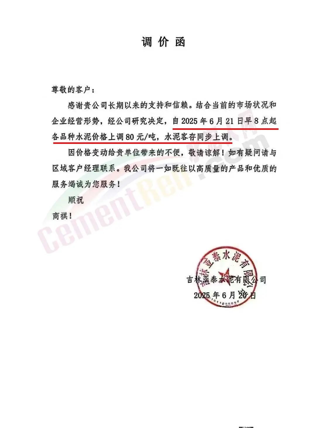 吉林亞泰鼎鹿水泥有限公司通知,結(jié)合當前的市場狀況和企業(yè)經(jīng)營形勢,經(jīng)公司研究決定,自2025年6月21日早8點起各品種水泥價格上調(diào)80元/噸,水泥客存同步上調(diào)。