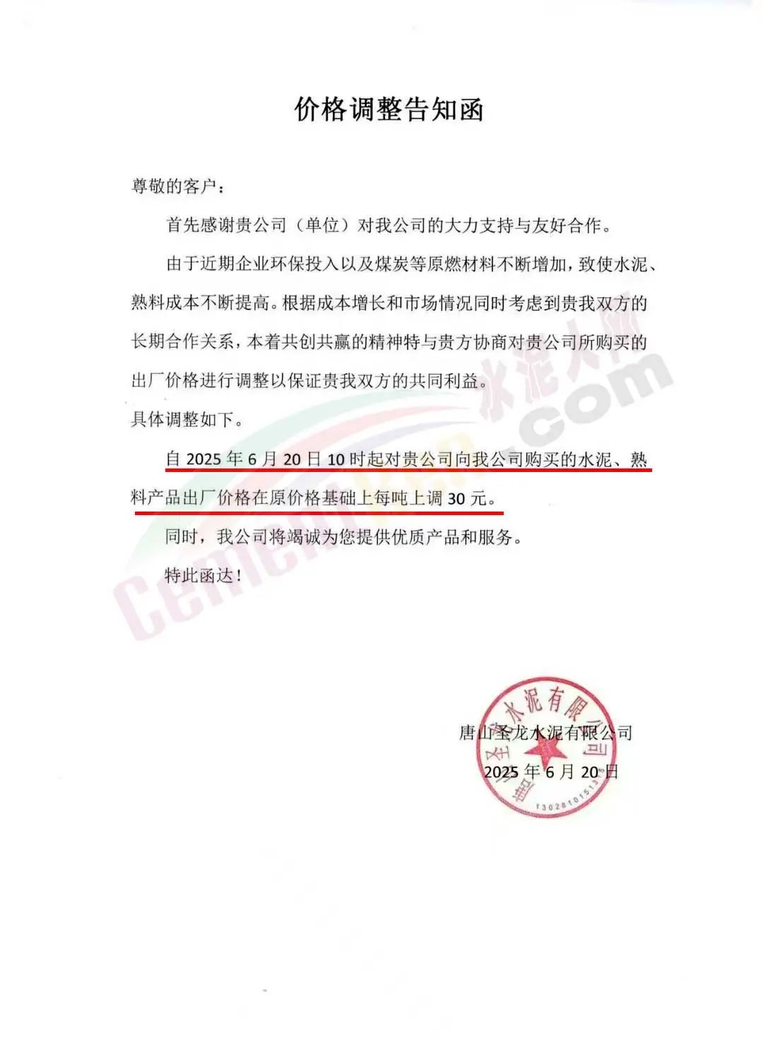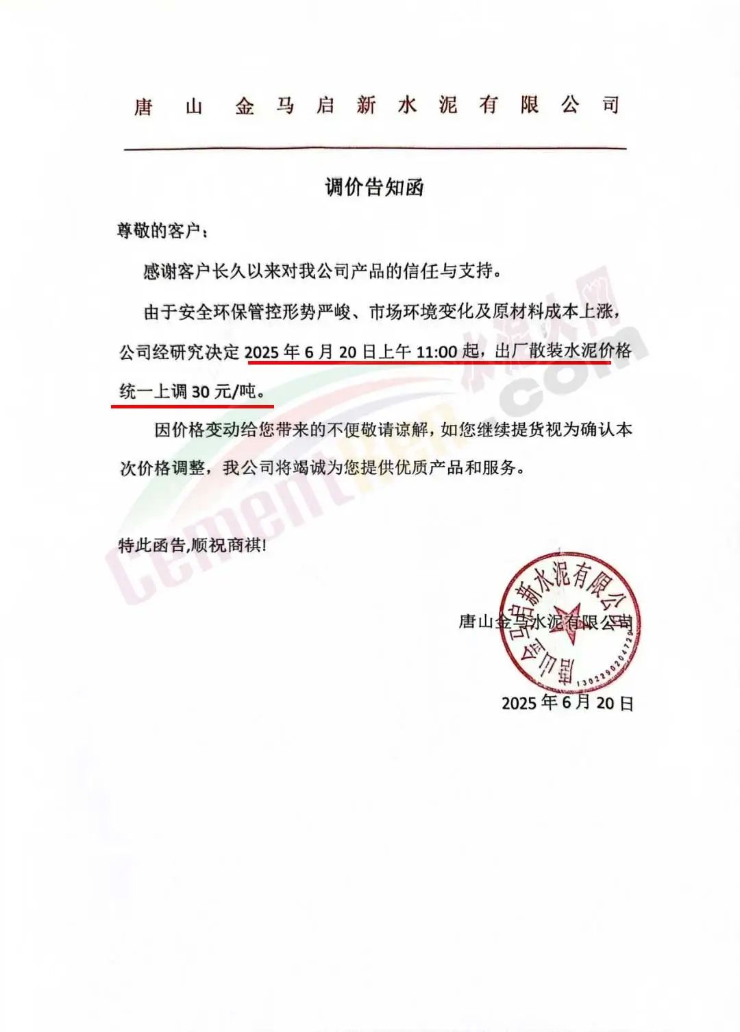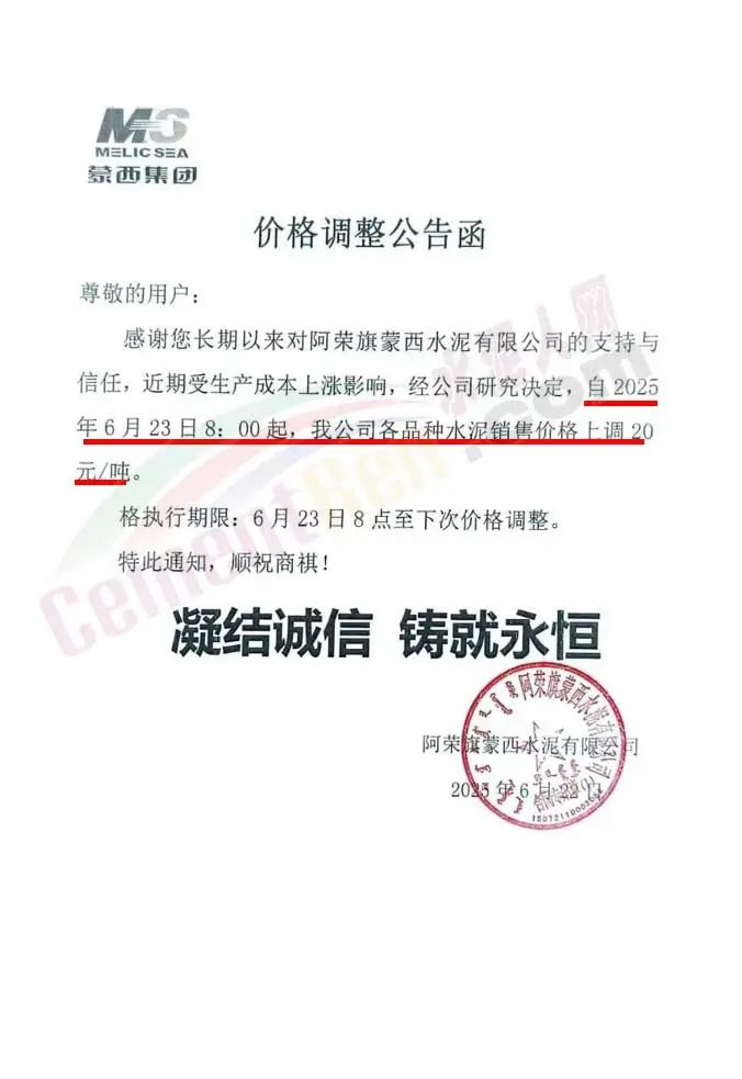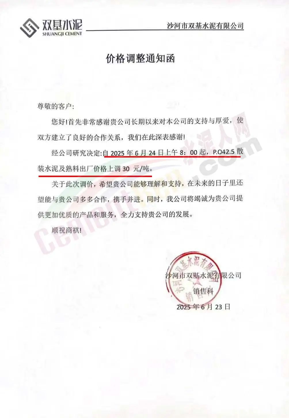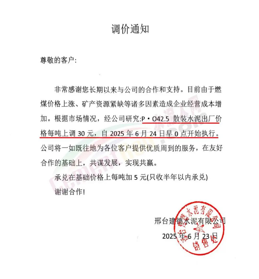 沙河市雙基水泥有限公司通知,經(jīng)公司研究決定自2025年6月24日上午8時起,P042.5散裝水泥及熟料出廠價格上調(diào)30元/噸。