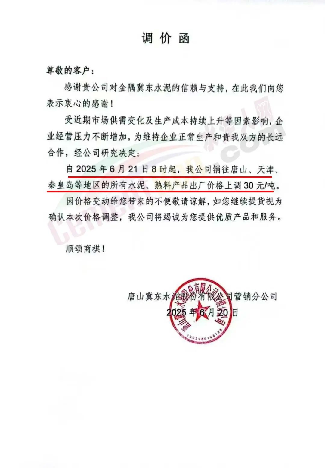 唐山冀東水泥股份有限公司營銷分公司通知,受近期市場供需變化及生產(chǎn)成本持續(xù)上升等因素影響,企業(yè)經(jīng)營壓力不斷增加,為維持企業(yè)正常生產(chǎn),經(jīng)公司研究決定:自2025年6月21日8時起,公司銷往唐山、天津、秦皇島等地區(qū)的所有水泥、熟料產(chǎn)品出廠價格上調(diào)30元/噸。