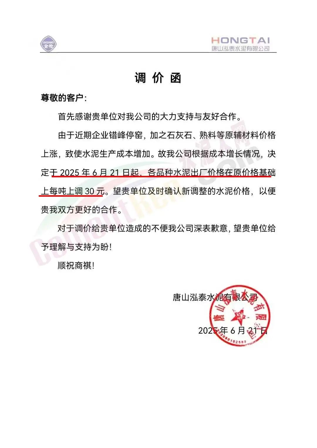 河北金隅冀東供應(yīng)鏈有限公司通知,近期原燃材料成本持續(xù)上漲、環(huán)保管控力度不斷加強,致使我公司水泥(熟料)生產(chǎn)成本增加。為維持企業(yè)正常生產(chǎn)運營和貴我雙方的長遠合作,根據(jù)當前市場情況,經(jīng)公司研究決定:自2025年6月24日0時起,公司銷售的所有水泥、熟料出廠價格在原價格基礎(chǔ)上上調(diào)30元/噸。