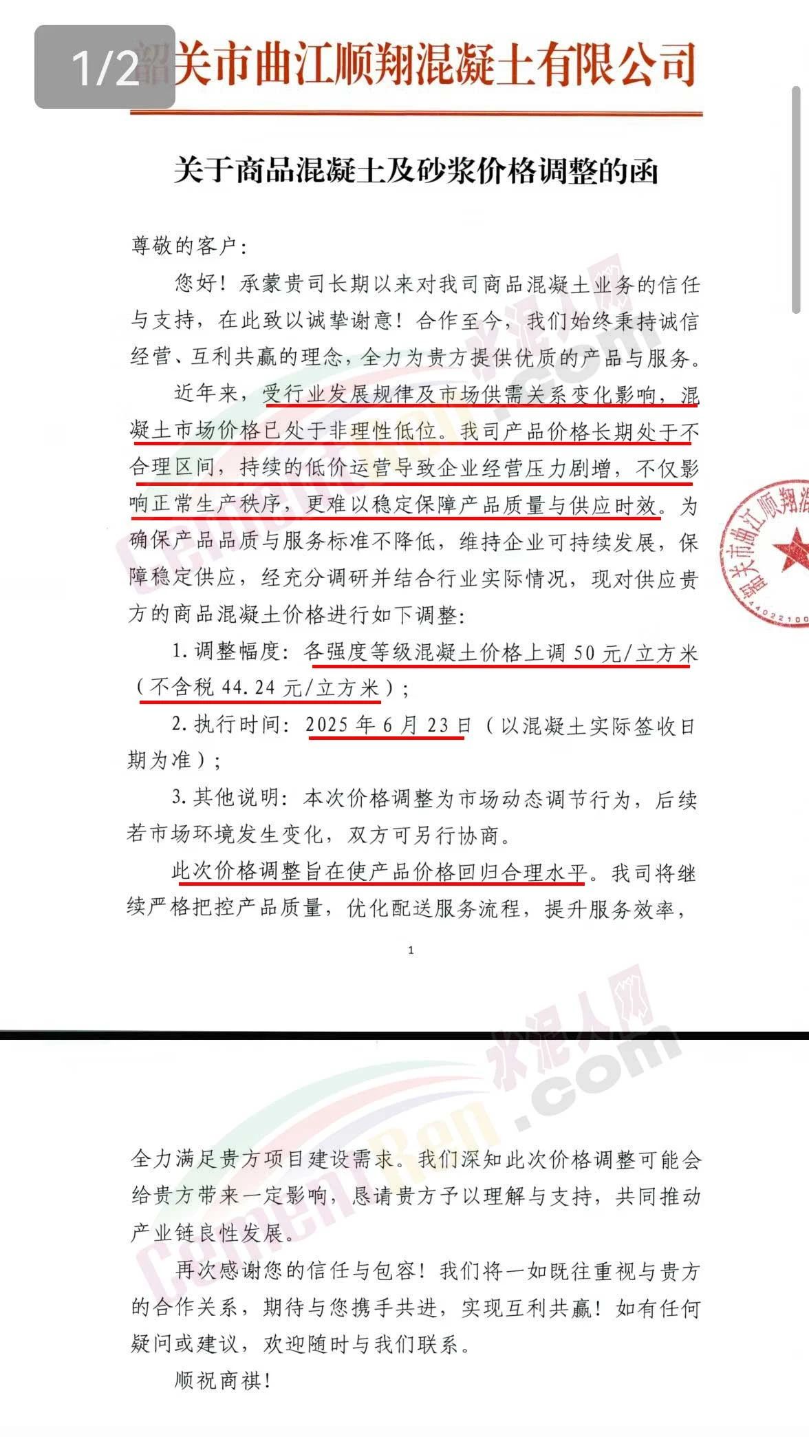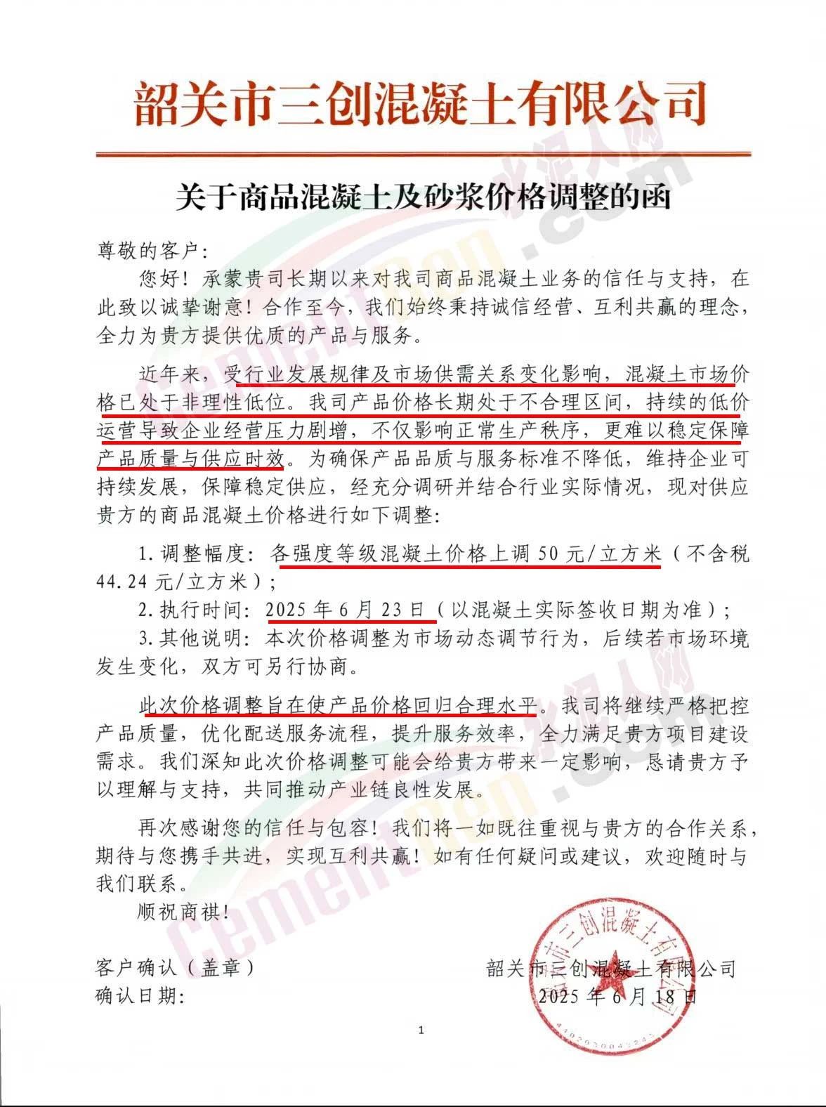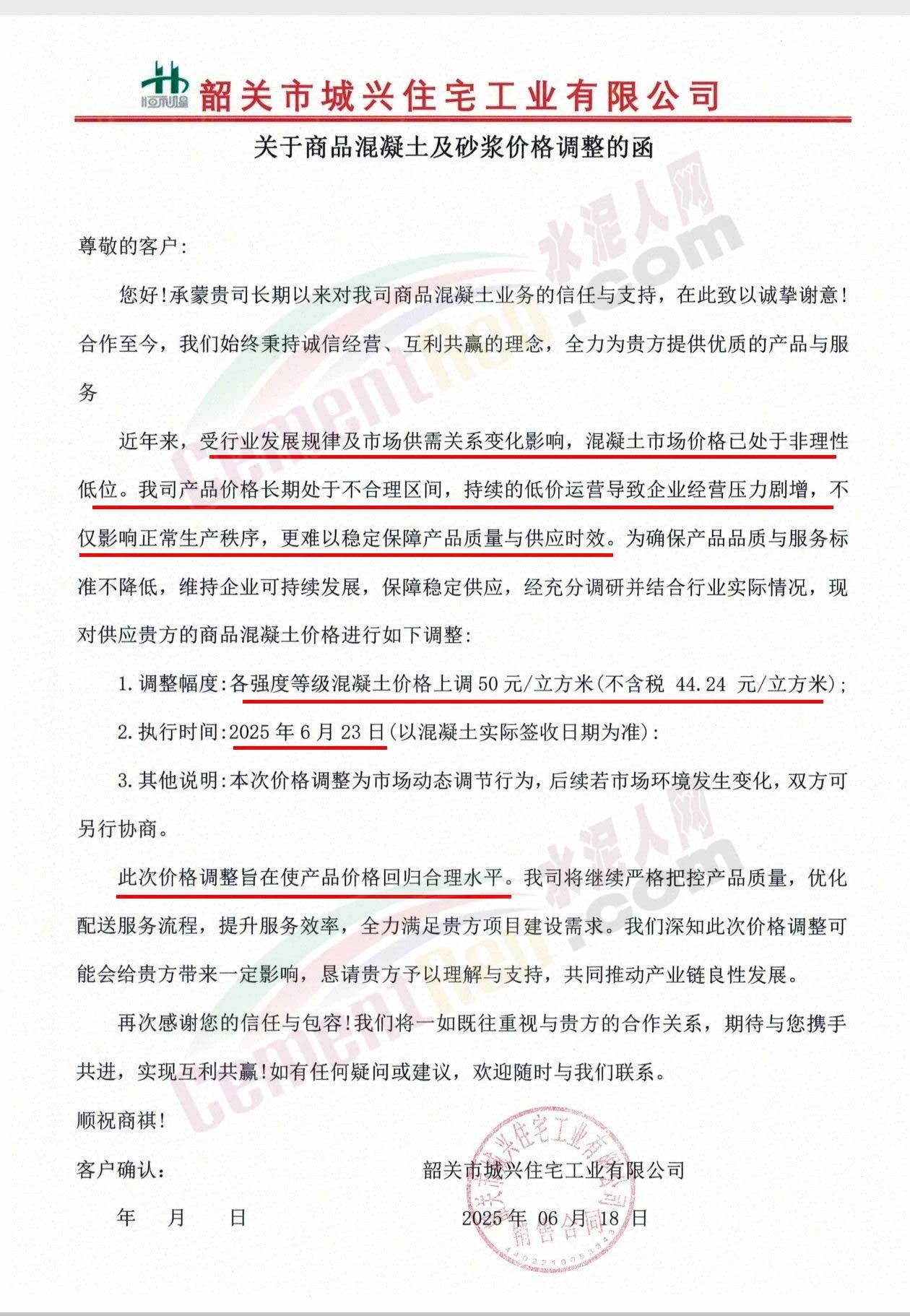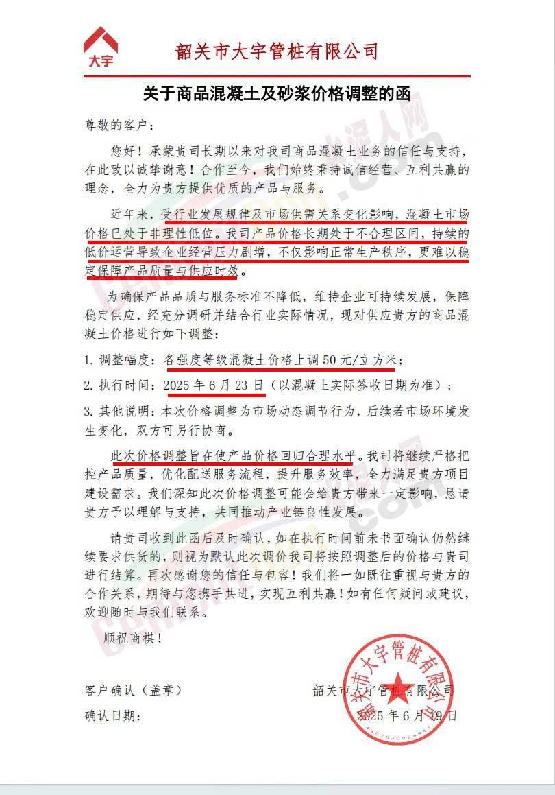 近日,乳源瑤族自治縣宏建商品混凝土有限公司、韶關(guān)市城興住宅工業(yè)有限公司、韶關(guān)市三創(chuàng)混凝土有限公司等近10家商品混凝土企業(yè)聯(lián)合發(fā)布調(diào)價(jià)函,宣布自2025年6月23日起,各強(qiáng)度等級(jí)混凝土價(jià)格統(tǒng)一上調(diào)50元/立方米。這一舉措不僅引發(fā)了行業(yè)震動(dòng),更被視為混凝土企業(yè)在長期低價(jià)競爭后的一次“絕地反擊”。
