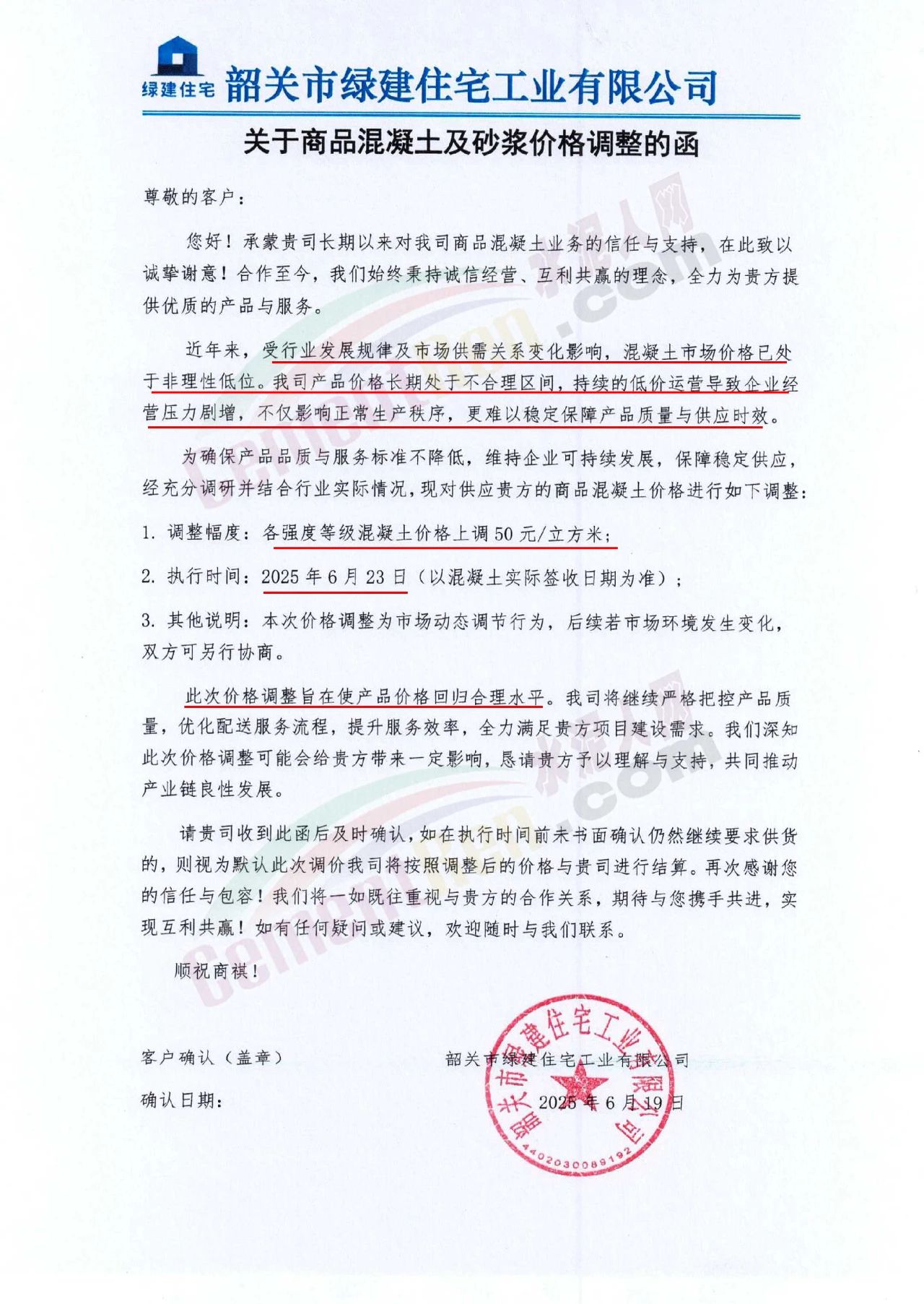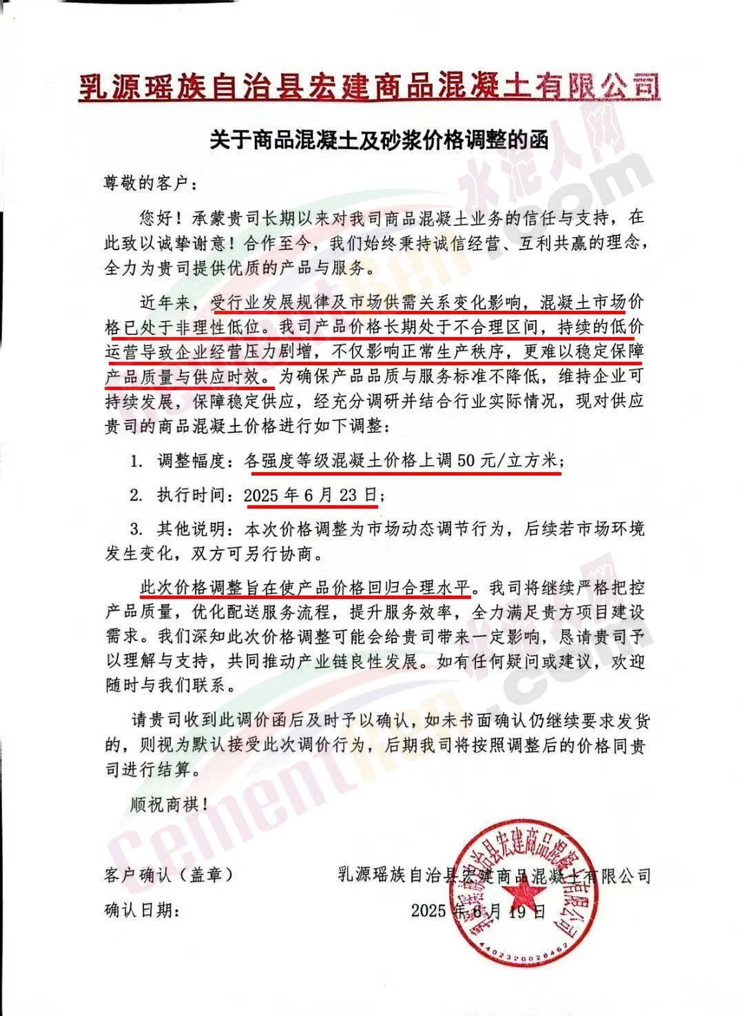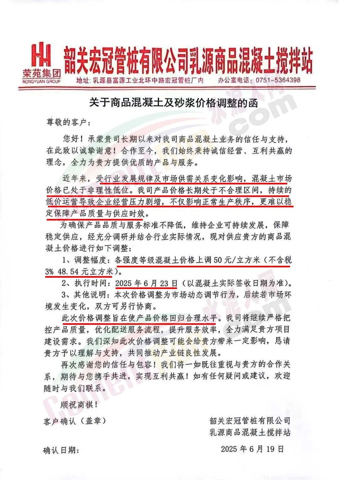 近日,乳源瑤族自治縣宏建商品混凝土有限公司、韶關(guān)市城興住宅工業(yè)有限公司、韶關(guān)市三創(chuàng)混凝土有限公司等近10家商品混凝土企業(yè)聯(lián)合發(fā)布調(diào)價(jià)函,宣布自2025年6月23日起,各強(qiáng)度等級(jí)混凝土價(jià)格統(tǒng)一上調(diào)50元/立方米。這一舉措不僅引發(fā)了行業(yè)震動(dòng),更被視為混凝土企業(yè)在長期低價(jià)競爭后的一次“絕地反擊”。