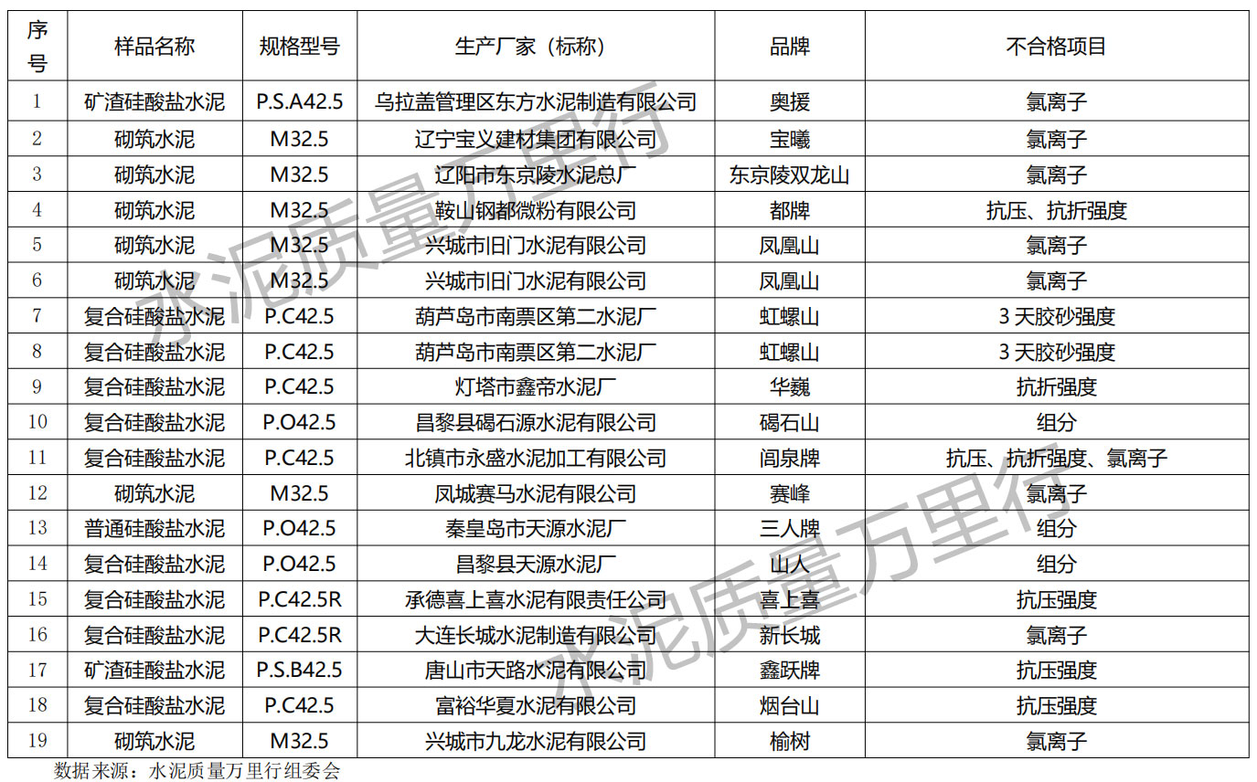 另一方面是質(zhì)量達(dá)標(biāo)率偏低。80批次樣品中,19批次檢測結(jié)果不符合國家標(biāo)準(zhǔn)要求,占比23.75%。不合格項目集中在氯離子含量、強(qiáng)度性能及組分三大類:其中,興城市舊門水泥有限公司、遼陽市東京陵水泥總廠等8家企業(yè)的產(chǎn)品氯離子超標(biāo);鞍山鋼都微粉有限公司“都牌”砌筑水泥等6批次產(chǎn)品,同時存在抗壓與抗折強(qiáng)度不合格問題;昌黎縣碣石源水泥有限公司、秦皇島市天源水泥廠等企業(yè)的3批次產(chǎn)品,因組分不符合標(biāo)準(zhǔn)。