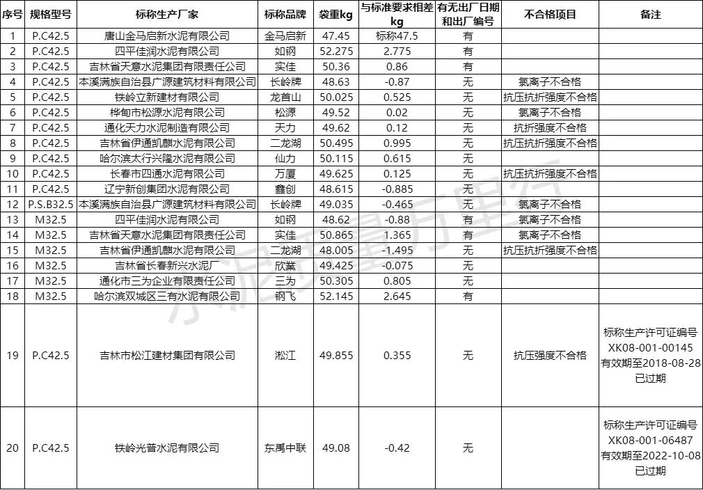更值得警惕的是,部分產(chǎn)品存在“多重不合格”問題。例如本溪滿族自治縣廣源建筑材料有限公司生產(chǎn)的“長嶺”牌P.C42.5、P.S.B32.5各一批次產(chǎn)品,不僅氯離子不合格,同時(shí)存在袋重不足;四平佳潤水泥有限公司的一批次“如鋼”牌M32.5水泥也出現(xiàn)氯離子超標(biāo)與袋重不足并存的情況,這類產(chǎn)品的質(zhì)量風(fēng)險(xiǎn)更為集中。